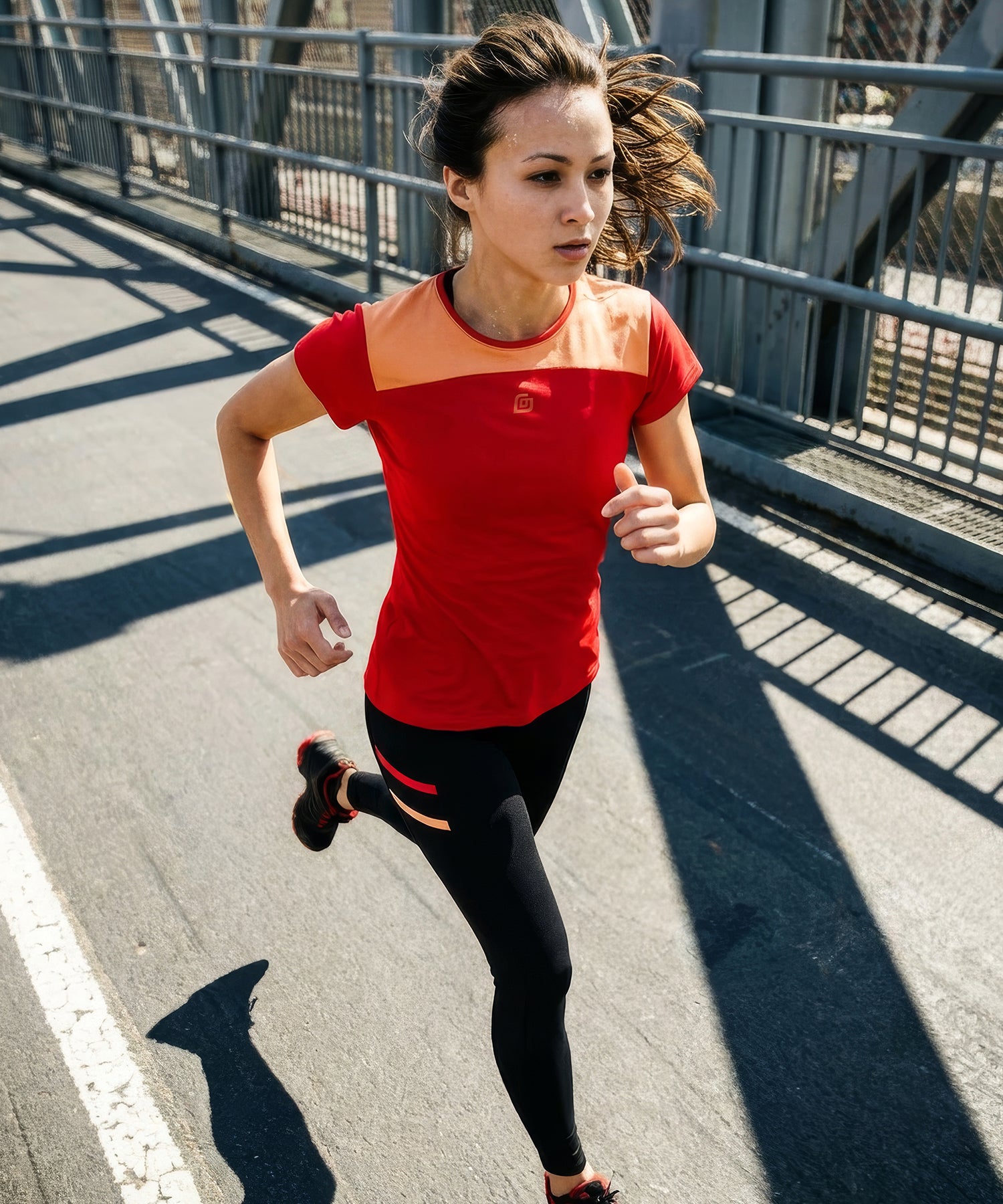 Joggerin macht gerade eine Pause und genießt den Ausblick auf die Natur. Sie trägt das KiiGO Damen Tanktop in rot und man sieht es von hinten mit dem überkreuzten Gummi und dem KiiGO Print. Auf der rechten Seite des Bildes sieht man die komplette KiiGO Damen Shirt Kombination in rot und peach:  Longshirt, T-Shirt und TanktopMan sieht die komplette KiiGO Damen Shirt Kombination in rot und peach:  Longshirt, T-Shirt und Tanktop